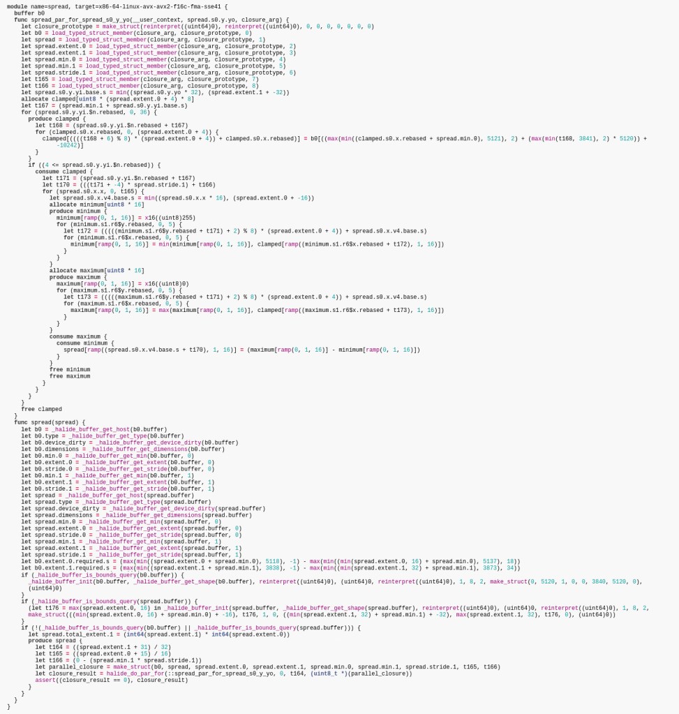 In general, it’s a bit hard to tell how the performance, parallelization and especially the memory consumption will change if you change the code. In pure C++, it can be easier because you get loop indentation, explicit parallelization and explicit allocations which make those things easy to spot. I wish there was a more explicit version of Halide where I can add pieces of pseudocode as documentation and have the compiler error if they don’t tell the truth.